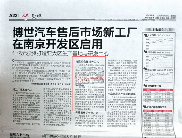 《现代快报》A22版-《博世汽车售后市场新工厂在南京开发区启用—与高校合作培养个人》