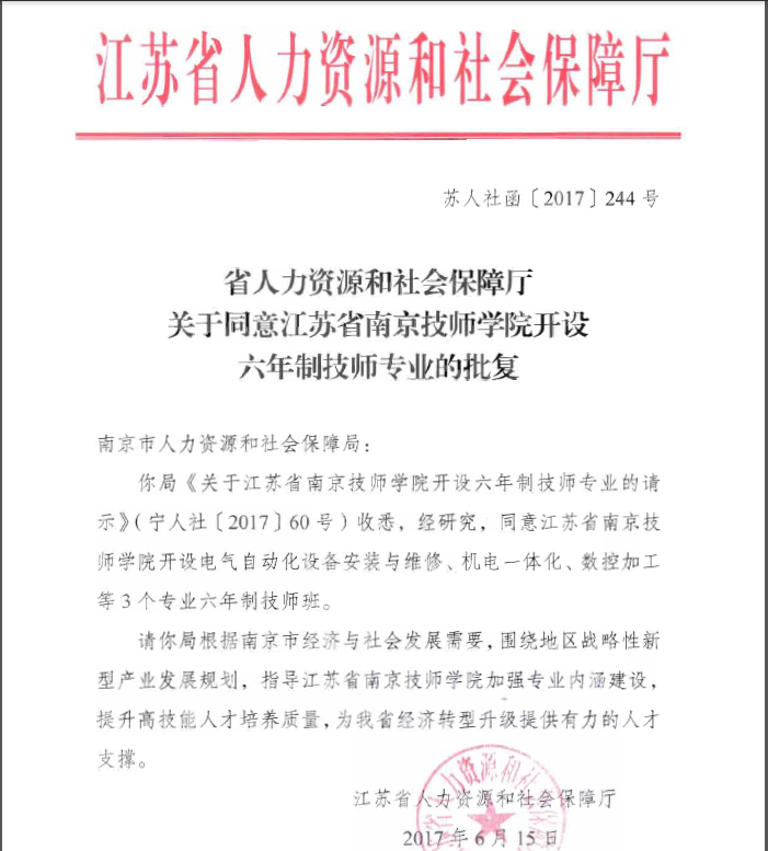 我院接到《省人力资源和社会保障厅关于同意江苏省华体会官方版网站登录入口开设六年制技师专业的批复》(苏人社函[2017]244号),同意开设电气自动化设备安装与维修、机电一体化、数控加工等3个专业。