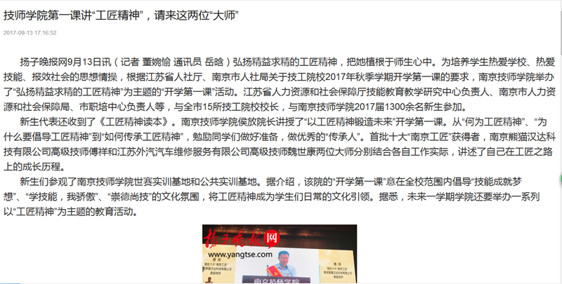 《扬子晚报网》-技师学院第一课讲“工匠精神”,请来这两位“大师”